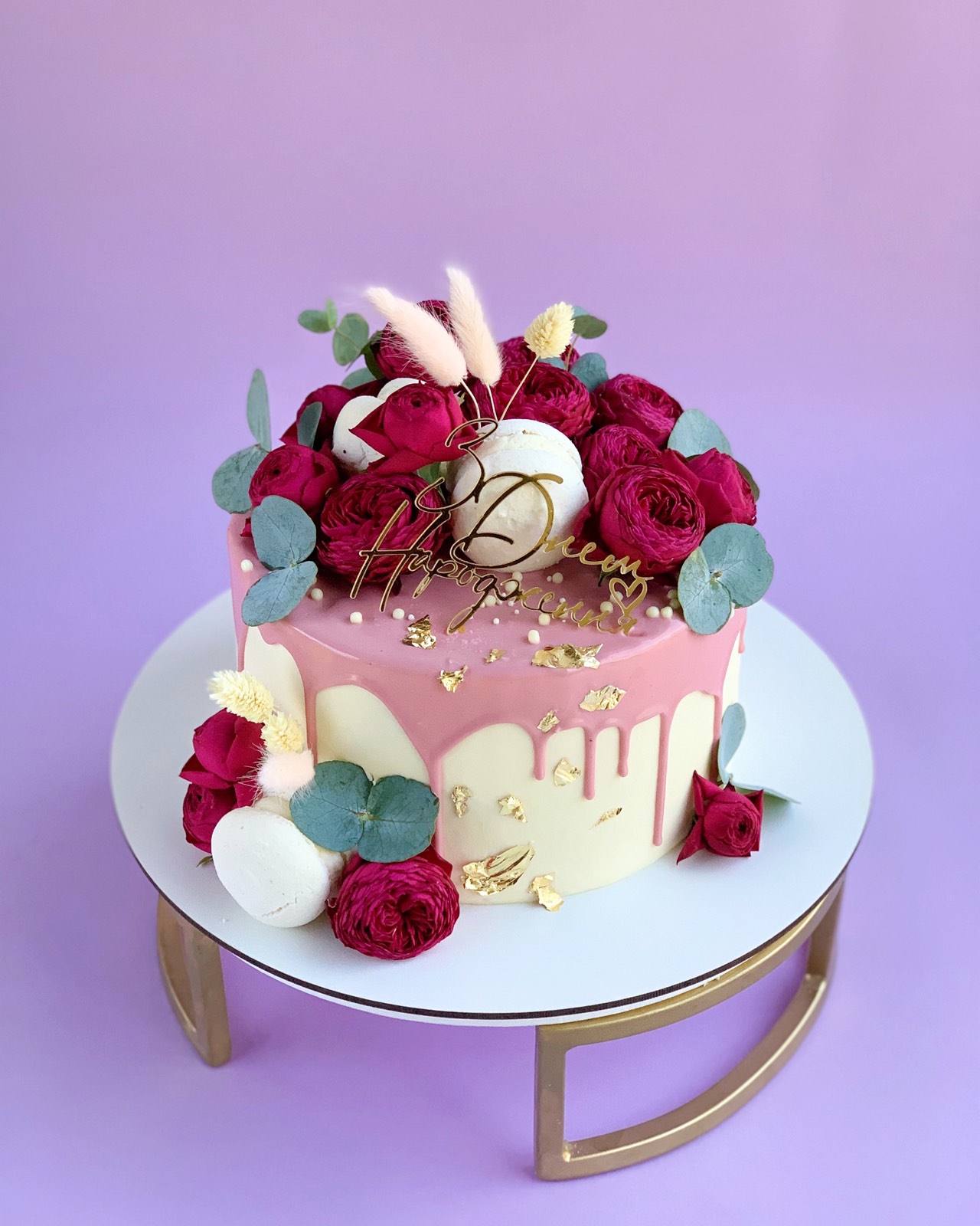 Один із найпопулярніших тортів на замовлення для жінок! Яскраві квіти, зелень, золото і найсмачніші макаронс!